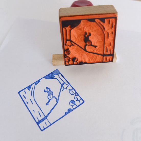 少し前に、友人が参加しているスラックライン同好会のイラストスタンプ作成の依頼を受け、手描きイラストに手彫りのゴム印を作成しました。
