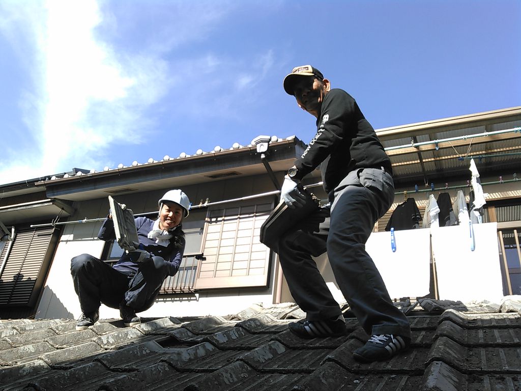 私も初めての作業にドキドキでしたが、喜多さんのフォローをすべくへっぴり腰でなんとか屋根に上がりました。