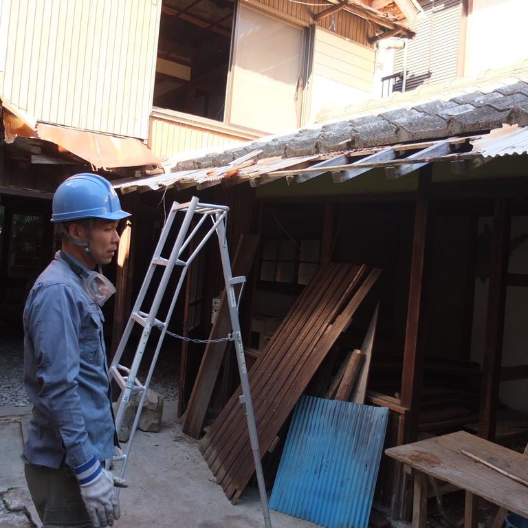 お風呂棟の屋根瓦を降ろす
