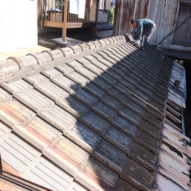 本日は奥の奥のトイレ&風呂場の棟の屋根瓦を取り外す作業をしました。
